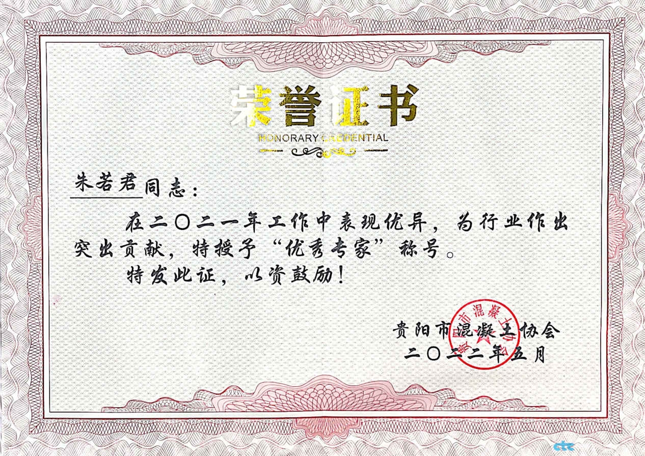 2022年5月30日下午,由貴陽市混凝土協(xié)會召開的貴陽市預(yù)拌混凝土行業(yè)實驗等級評定工作總結(jié)會上,我司員工朱若君、陶冠園在參與貴陽市混凝土企業(yè)專項實驗室等級評定工作中被貴陽市混凝土協(xié)會授予“2021年度優(yōu)秀專家”榮譽稱號。