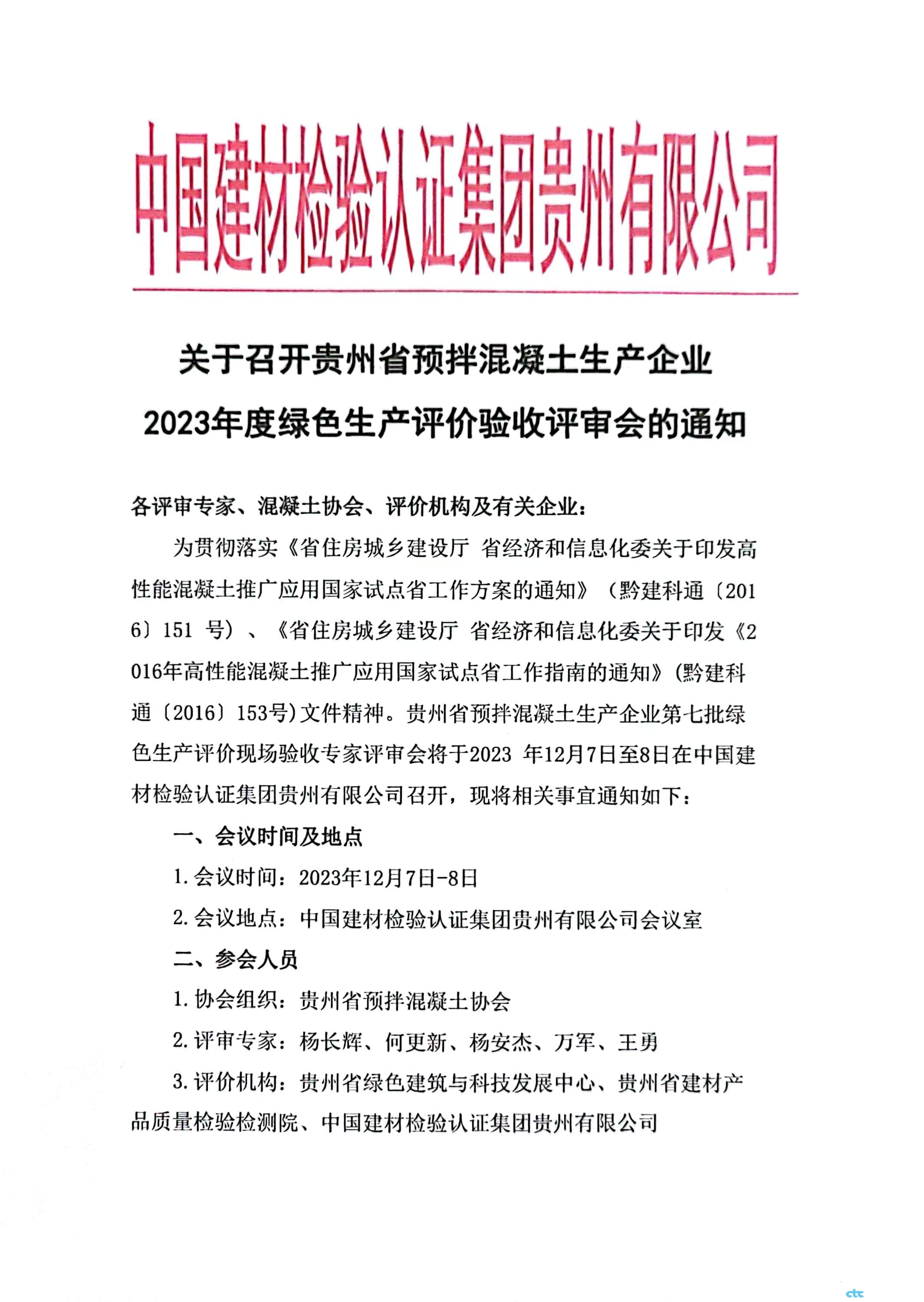 關(guān)于召開(kāi)貴州省預(yù)拌混凝土生產(chǎn)企業(yè) 2023年度綠色生產(chǎn)評(píng)價(jià)驗(yàn)收評(píng)審會(huì)的通知