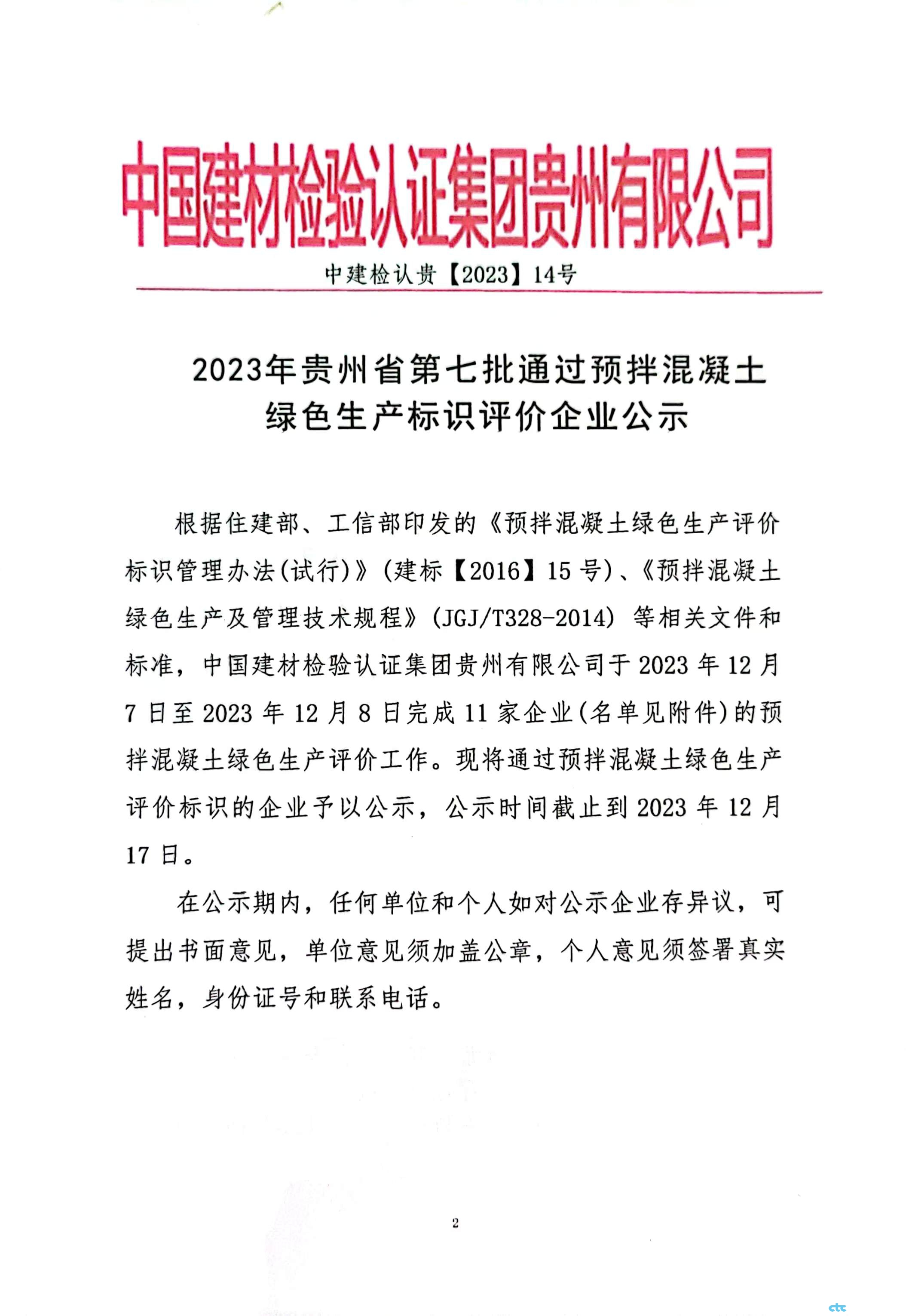 2023年貴州省第七批通過預(yù)拌混凝土綠色生產(chǎn)標(biāo)識評價企業(yè)公示